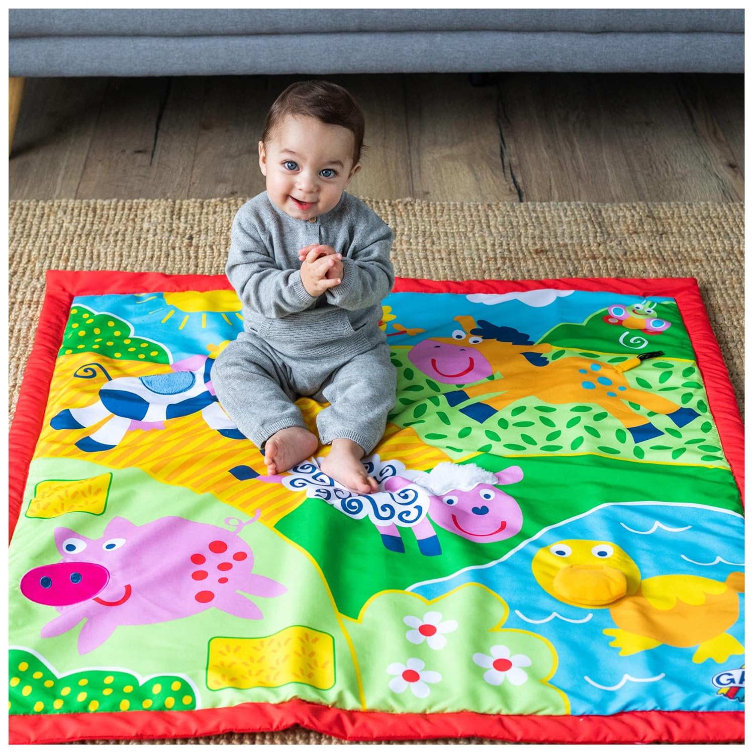 Galt Toys is a brand leader of developmental and creative products. Our baby range now features a large multi-sensory playmat with 6 colourful farm friends. Soft and padded for baby's comfort, the perfect place for a young baby to lie down. As baby develops, there are textures and sounds to explore. Features: squeaky beak, velour patch, shiny nose, crinkle wing, woolly head and cord tail. Packed in a PVC bag with carry handle. Machine washable. Size: 100cm x 100cm (39" x 39") square. Age: From 0 Months. Pack dimensions: 26 x 42 x 8cm. Fully safety tested.