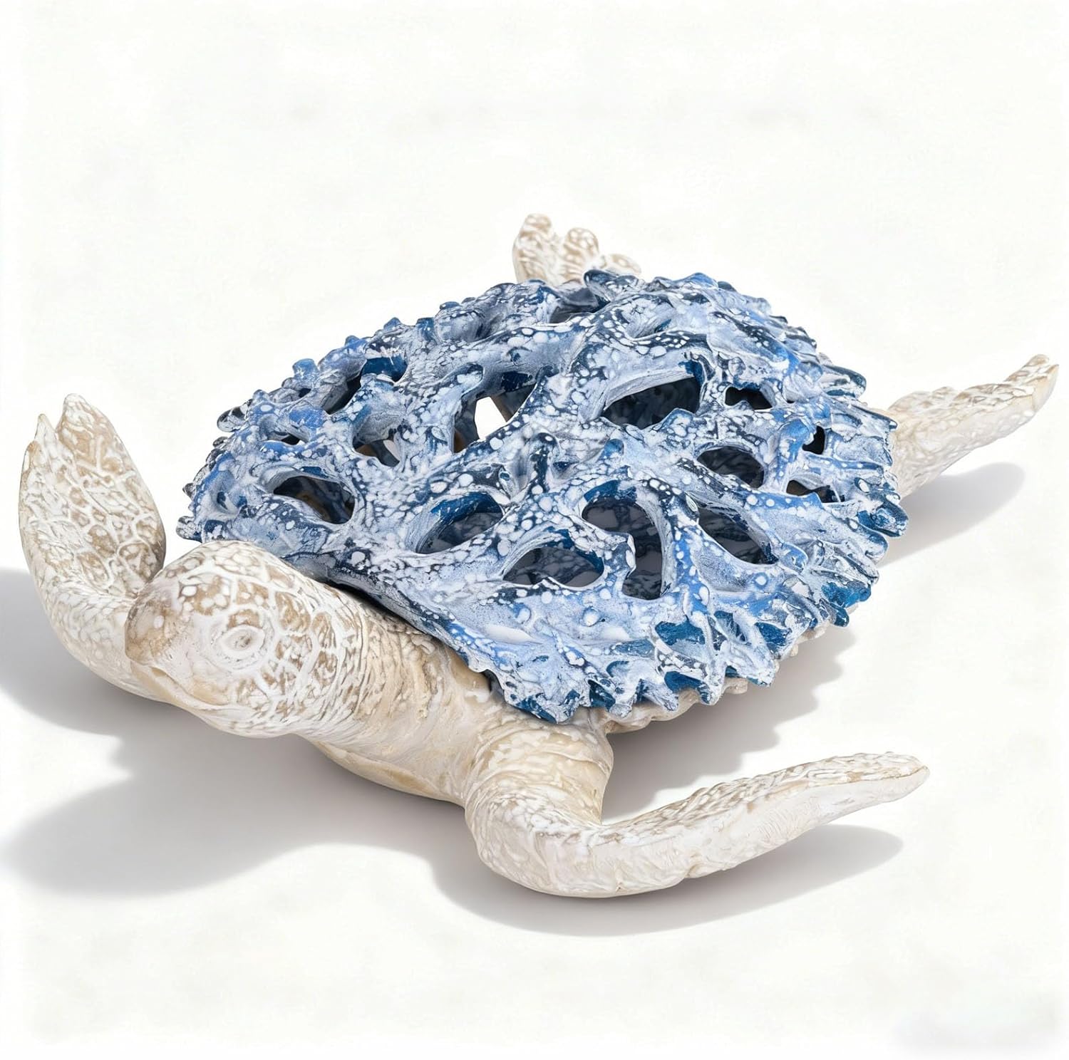 Bring a clean, coastal accent into your space with this large white turtle statue inspired by the calm beauty of sea turtles. The openwork shell texture adds airy detail while the neutral white finish blends effortlessly into sea themed decor, sea decor, and modern ocean decor. Style it as coastal room decor on an entry console, as coastal shelf decor on a bookshelf, or as a refined centerpiece accent for beach home decor.This statement turtle sculpture measures approximately 12.8 in long x 12 in wide x 3.7 in high, giving it a noticeable presence without feeling tall or bulky. Use it as elegant turtles decor on a coffee table, or as a calming accent for an entryway display. It also fits workspaces beautifully as turtle desk decor and turtle office decor, pairing naturally with beach desk decor and beach decor for office styling.Made from resin, this sea turtle statue is designed for indoor display and sits flat and stable on surfaces.For safe delivery, it ships protected with foam and a sturdy paper box. Packaged weight is about 2.27 kg, which helps it feel substantial and secure when placed.Decorating ideas: pair it with shells, driftwood tones, and coral decor for a layered coastal vignette. It complements sea turtle decor, coordinates with other ocean figurines, and adds softness to sea decorations for home. It also makes a strong addition to curated shelves and collections, including turtle figurines collectibles and small décor accents like turtle knick knacks, and supports bilingual intent such as tortugas decoracion.