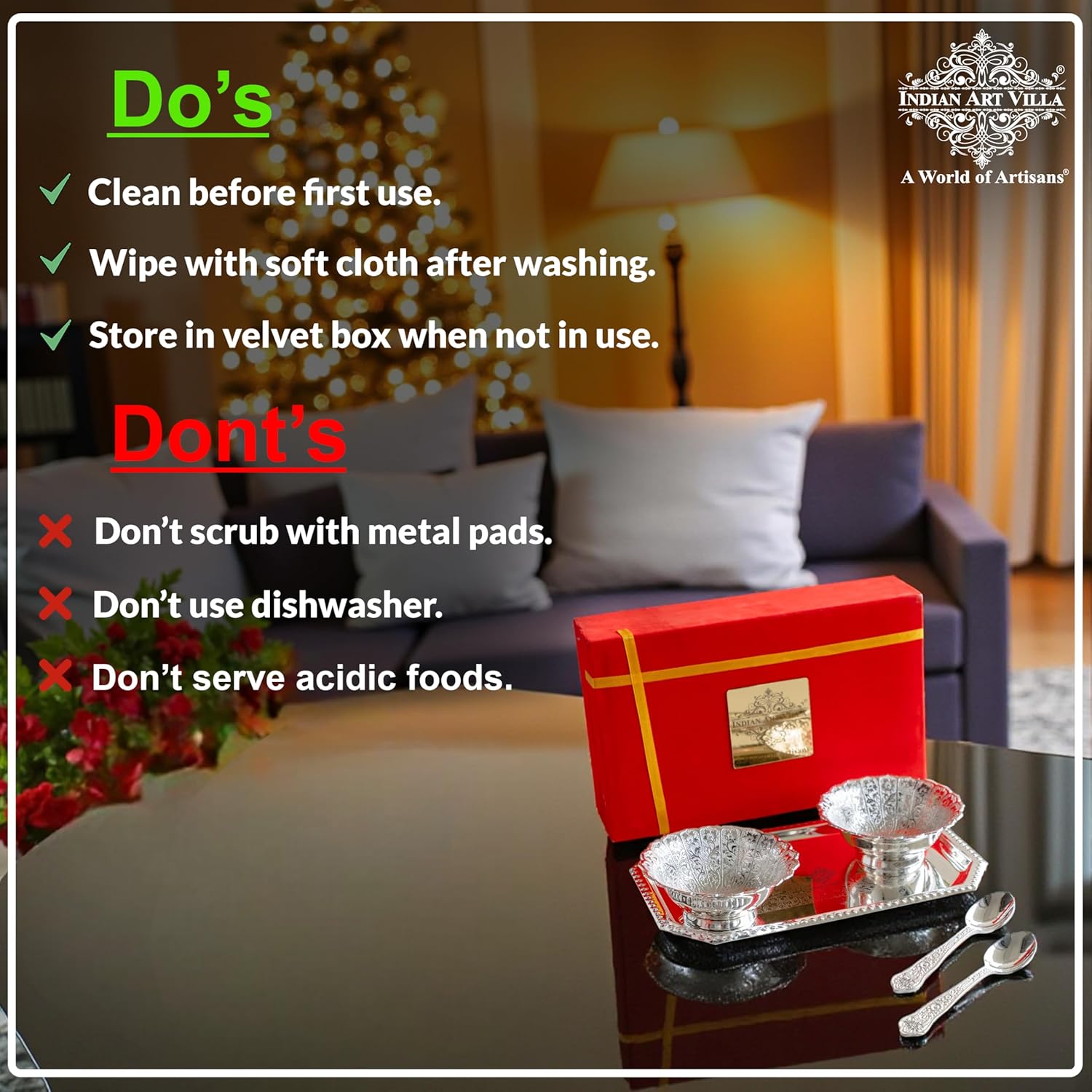 Bring home the elegance of Indian heritage with the Indian Art Villa Silver-Plated Bowl Spoon Tray Set – a timeless ensemble designed to elevate your celebrations and everyday luxury. This set includes 2 silver-plated bowls, 2 coordinating spoons, and 1 beautifully engraved rectangular tray, all neatly packed in a red velvet gift box. Crafted by skilled artisans, each piece radiates sophistication and traditional charm, making it a versatile addition to your serveware or a memorable gift for loved ones. Whether used to serve dry fruits, sweets, or simply displayed as a centerpiece, this set captures attention with its stunning silver finish and ornamental curves. Perfect for weddings, housewarmings, Diwali, Christmas, New Year, or any special occasion, it symbolizes elegance, thoughtfulness, and cultural richness. The compact size ensures convenience without compromising on style, and the quality construction ensures lasting brilliance with minimal maintenance. Choose this decorative silver-plated gift set to create lasting impressions – whether it’s for your own home or as a cherished gift for someone special.
