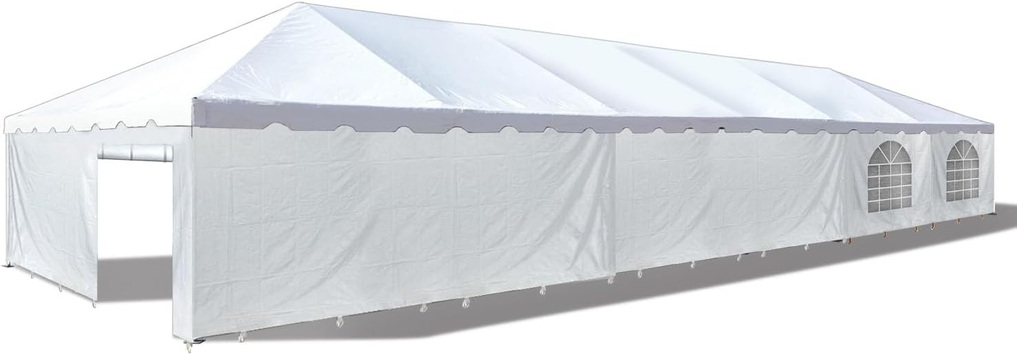 Host massive outdoor gatherings with ease using the Party Tents Direct 20x40 Weekender West Coast Frame Tent with Sidewalls. This comprehensive package is a heavy-duty solution for weddings, commercial events, and large backyard celebrations. Designed for rapid setup and professional results, this expansive tent provides 800 square feet of covered space without the complexity of permanent installations or the obstruction of center poles. The premium canopy is made from 14 oz translucent PVC vinyl that is waterproof, UV-resistant, and flame-retardant. A fire-retardant certification patch is sewn directly into the top for safety compliance. The translucent material shields guests from the elements while allowing natural light to filter through, keeping the interior bright. For maximum durability, panels feature 1-inch heat-sealed overlapping seams and industrial-strength construction. The sturdy West Coast frame is built from 1.5-inch diameter galvanized steel with zinc-plated fittings to resist rust and corrosion. Because there are no center poles, you gain an entirely open floor plan. This unobstructed space comfortably fits 67 guests for sit-down dining, 100 for row seating, or 160 for cocktail-style events. As your needs grow, the expandable system allows you to increase the tent size by adding compatible components in the future. This deluxe kit includes a complete vinyl sidewall system: three cathedral window panels for elegance, two solid panels for privacy, and one solid panel with a zippered door for easy access. These walls allow you to fully enclose the structure to protect against wind or rain. Whether installing on grass, asphalt, or decking, this free-standing tent provides a reliable venue for any large-scale occasion. The package includes the vinyl top, frame, sidewall kit, and anchoring hardware, all backed by a 90-day manufacturer warranty.