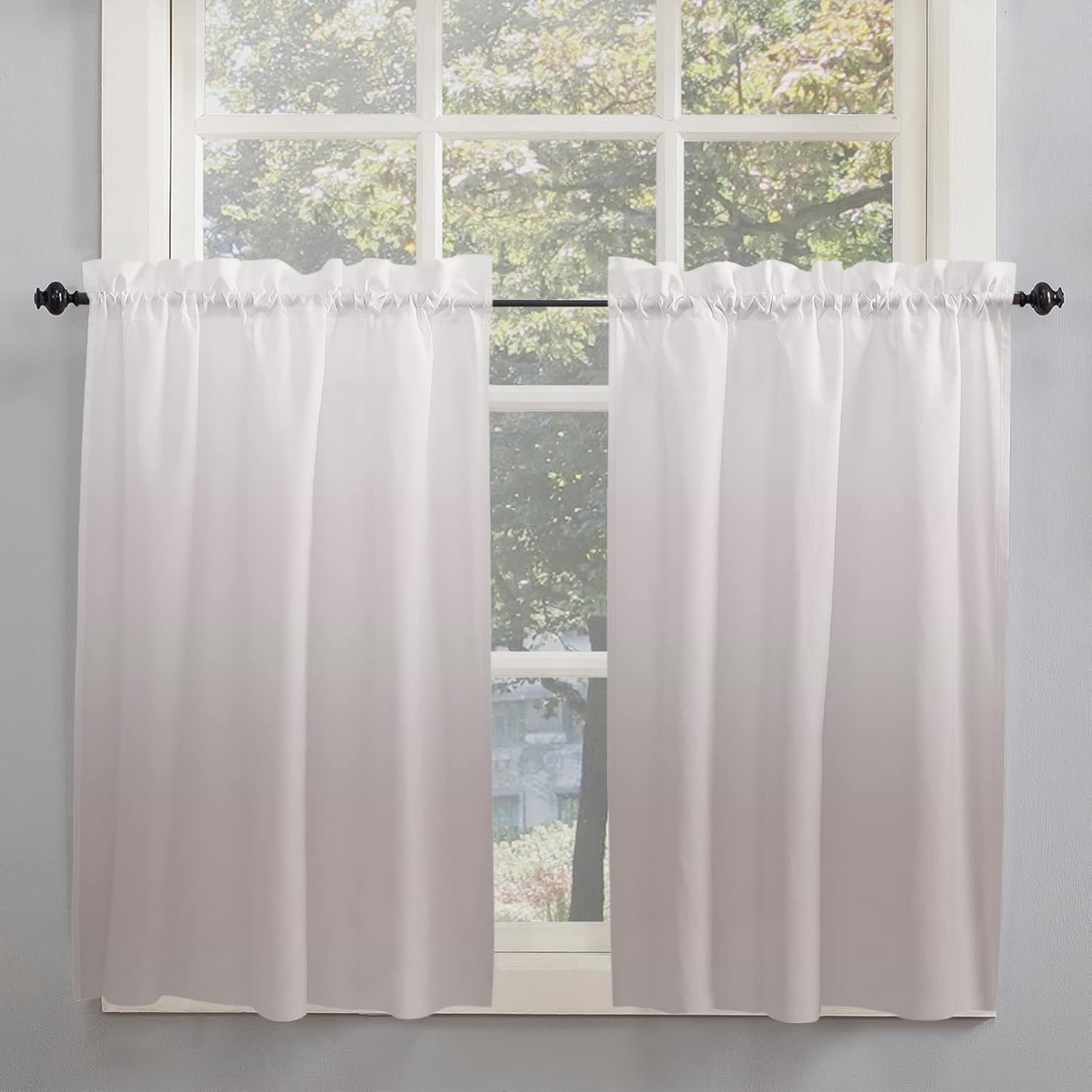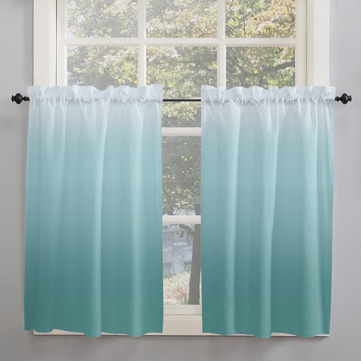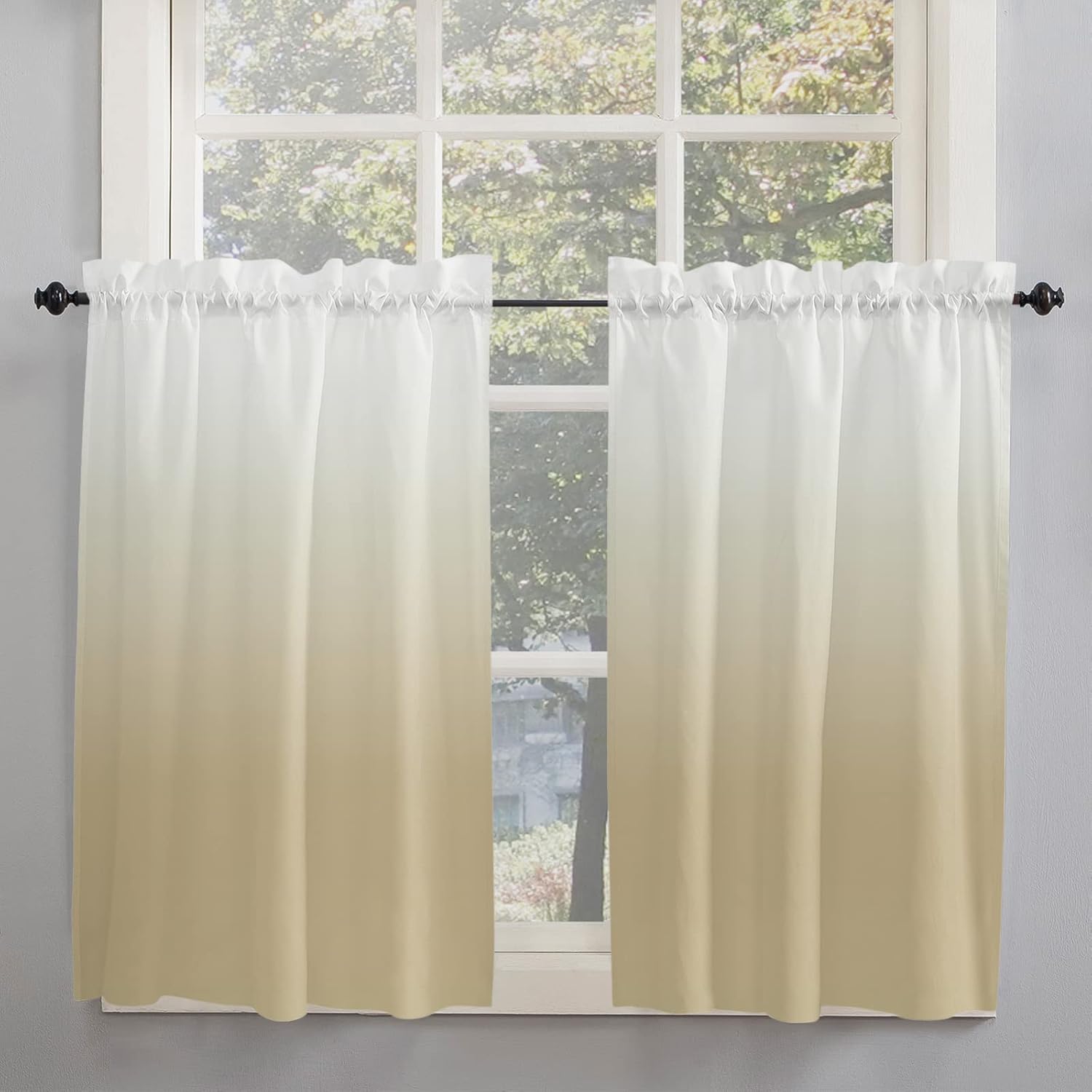 Ombre Curtain Tiers for Windows Feature: Made with a smooth polyester material, it offers a soft and sophisticated look. Rod pocket top, constructed with 1" header and 3" rod pocket, slips effortlessly across your curtain rod, tool-free installation. The small curtain allows part natural light to pass through during the day. Curtains protect your privacy to the fullest extent without affecting room lighting. These half window curtains print with bright color and elegant pattern, won't fade even after long time use, add character to your kitchen or bathroom. Perfect for any places where you want to decorate or shade sunlight, providing privacy protection for your house. Combine with valance can bring different experiences to your living room, bedroom, kitchen or any other small windows. Specification: Available Size: 27.5"x24" / 27.5"x36" / 27.5"x45" / 42"x45" / 42"x54" / 42"x63" / 52"x45" / 52"x54" / 52"x72" Material: Polyester Package: 2 x Tier Curtains Easy Care Instructions: Machine washable in cold water. Do not bleach. No dry cleaning. Iron at low heat if required. 100% Satisfaction Guarantee: Your purchase includes an extended 30 days warranty. If you have any question, please don’t hesitate to contact us. Warm Tips: Before choosing your favorite curtains, please measure the width of your pole and window. Due to different screen display, the color of actual item may vary slightly from images.